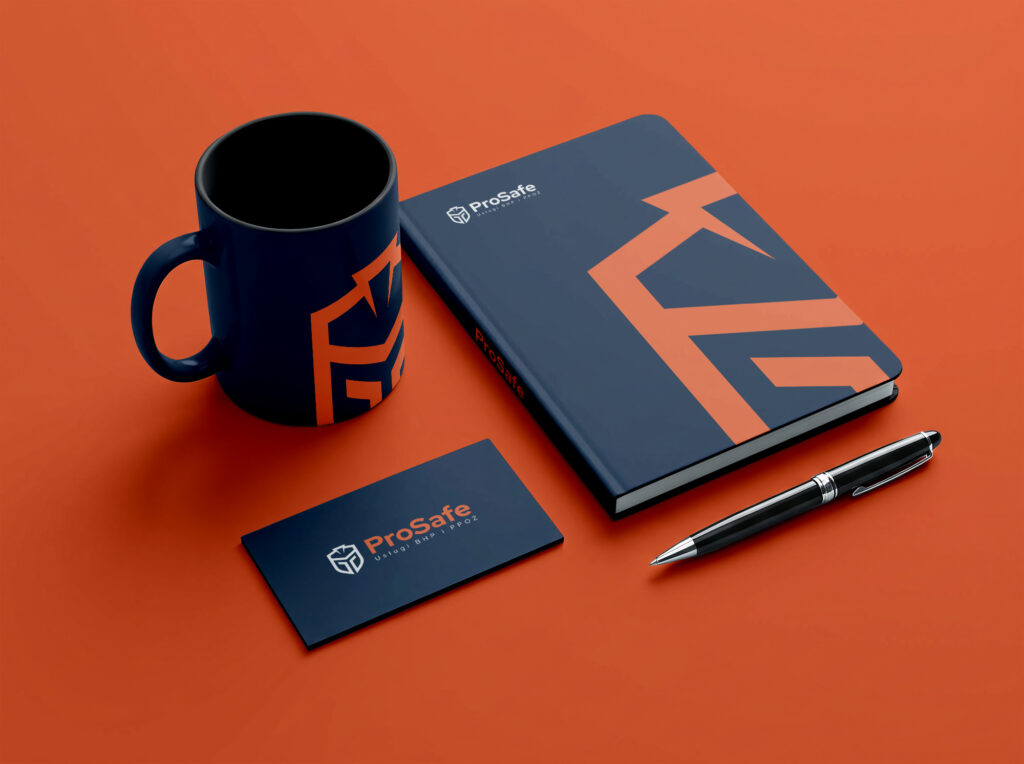 Zastosowana kolorystyka dodatkowo wzmacnia przekaz. Granat buduje zaufanie i stabilność, natomiast pomarańcz pełni funkcję ostrzegawczą i sygnalizacyjną, co idealnie wpisuje się w branżę BHP i PPOŻ. Dzięki temu logo firmowe ProSafe wyróżniają się na tle konkurencji.